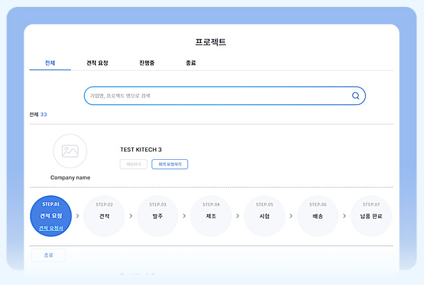 In the project management menu, you can check the progress stage (up to 7 steps from quotation request to completion of delivery) of all projects carried out with demand companies and manage projects online.